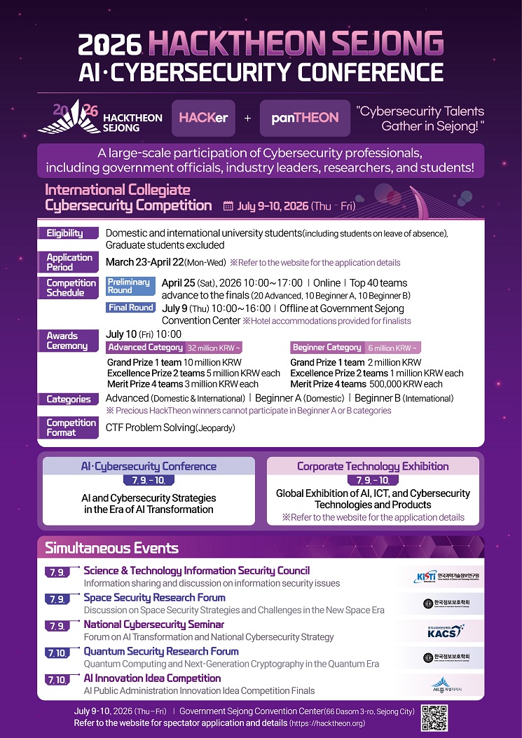 세종특별자치시에서는 대학생 사이버보안 역량 강화 및 인재 발굴을 위해 매년「핵테온 세종(HackTheon* Sejong)」국제 대학생 사이버보안 경진대회를 개최하고 있습니다. 관심있는 학생들의 많은 지원 바랍니다.