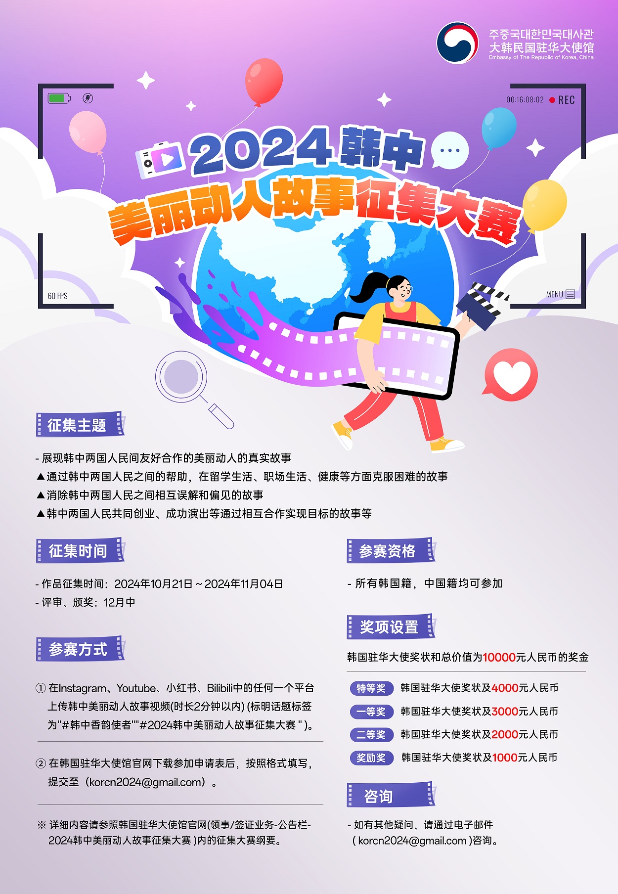 大韩民国驻华大使馆主办的『2024 韩中美丽动人故事征集大赛』正式开始啦!想跟大家分享值得称赞或美丽动人的故事吗? 想参赛的朋友们把故事制作成视频之后,和参赛申请表一起提交就可以啦!欢迎大家踊跃参与!