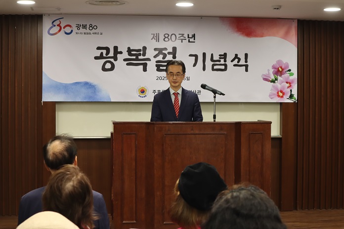 8.15(금) 오전 11시 총영사관은 제80주년 광복절 기념식을 총영사관 5층 강당에서 개최하였습니다. 동 기념식에는 천성환 총영사 대리를 비롯하여 총영사관 직원과 홍콩한인회, 홍콩한인상공회, 민주평통 홍콩지회, 홍콩한인여성회, 세계한민족여성네트워크 홍콩지부, 홍콩한인요식업협회, 홍콩한인체육회 임·직원 및 고문 등 50여명이 참석한 가운데 천 총영사 대리는 8.15 대통령 경축사를 대독하였으며, 참석자들은 광복절 노래 제창과 만세 삼창으로 광복절 의미를 다함께 되새기는 기회를 가졌습니다.